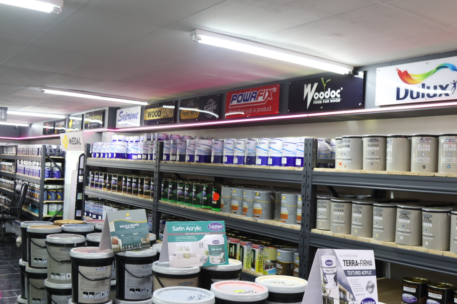 We stock a complete range for homes and buildings: interior/exterior paints, wood finishes, waterproofing solutions, PVA, acrylics, roof coatings (including chrome aluminium for heat reflection), wood primers, polyurethane and epoxy floor paints — for both DIY and professional use.